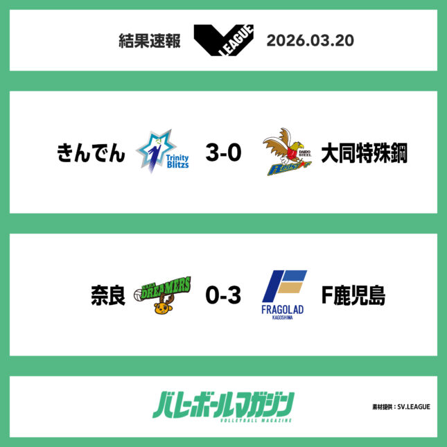 FSS35スポーツアリーナでは奈良ドリーマーズとフラーゴラッド鹿児島が対戦し、セットカウント0-3のストレートでアウェイのフラーゴラッド鹿児島が勝利した。奈良ドリーマーズは順位を1つ下げて6位に後退した。