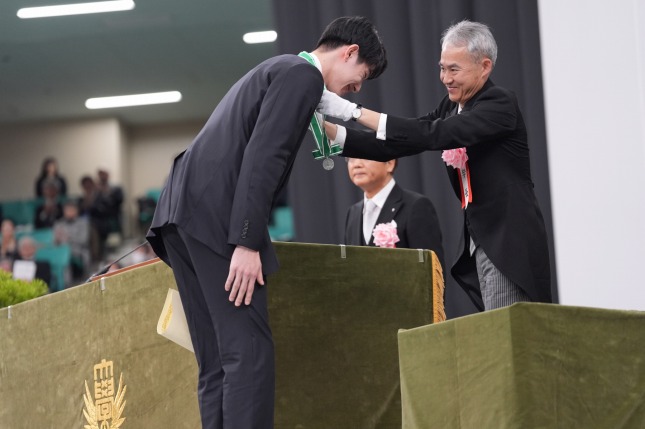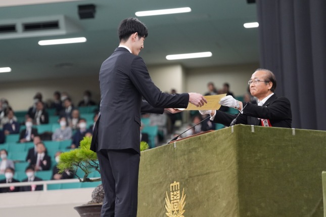 バレーボール日本代表で大阪ブルテオン所属の甲斐優斗が22日、日本武道館にて行われた専修大学の卒業式に出席。同大学で学術および体育の分野で顕著な成績を収めた学生に対し、卒業にあたって授与される「川島記念賞」の体育賞を受賞し、体育賞受賞者の総代としてスピーチも行った。