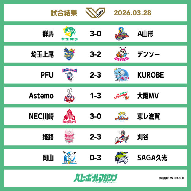 大同生命SV.LEAGUE WOMEN・28日の結果