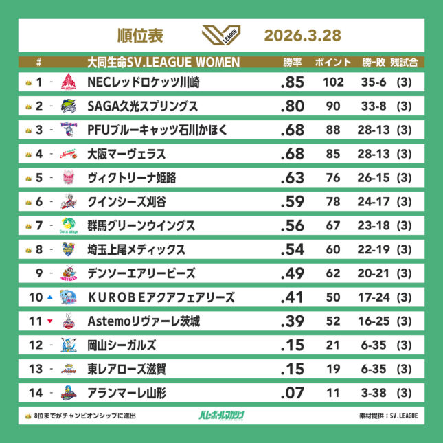 埼玉上尾と群馬がホームで勝利。両チームとも29日も勝利の場合、チャンピオンシップ進出決定。SAGA久光はレギュラーシーズン2位以上が確定 SV女子