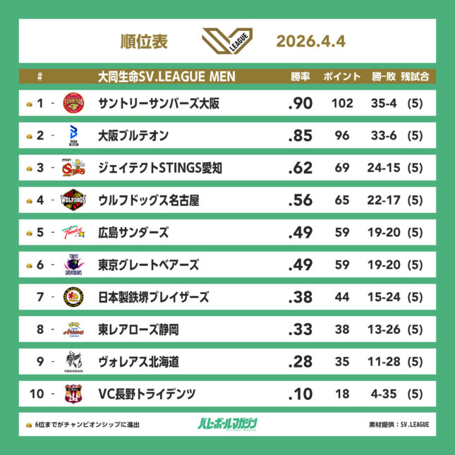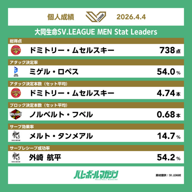 - レギュラーシーズンのリーダーズと個人表彰受賞者が決定。トップスコアラーはオリビア・ロジャンスキ(群馬) SV女子 [SV女子] / 2026.04.09