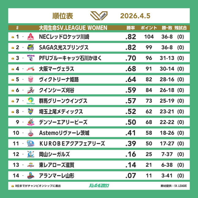 レギュラーシーズン全日程が終了。チャンピオンシップ進出最後の1枠は埼玉上尾に決定 SV女子