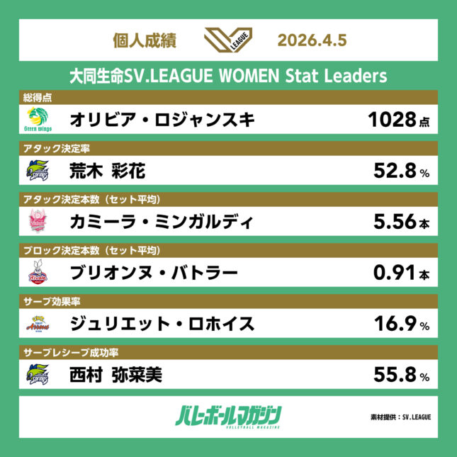 - レギュラーシーズンのリーダーズと個人表彰受賞者が決定。トップスコアラーはオリビア・ロジャンスキ(群馬) SV女子 [SV女子] / 2026.04.09