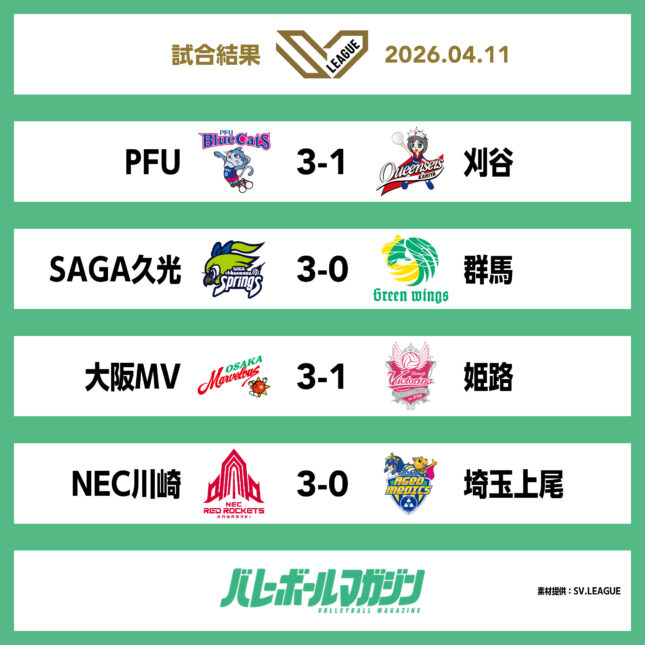 大同生命SV.LEAGUE WOMEN・11日の結果