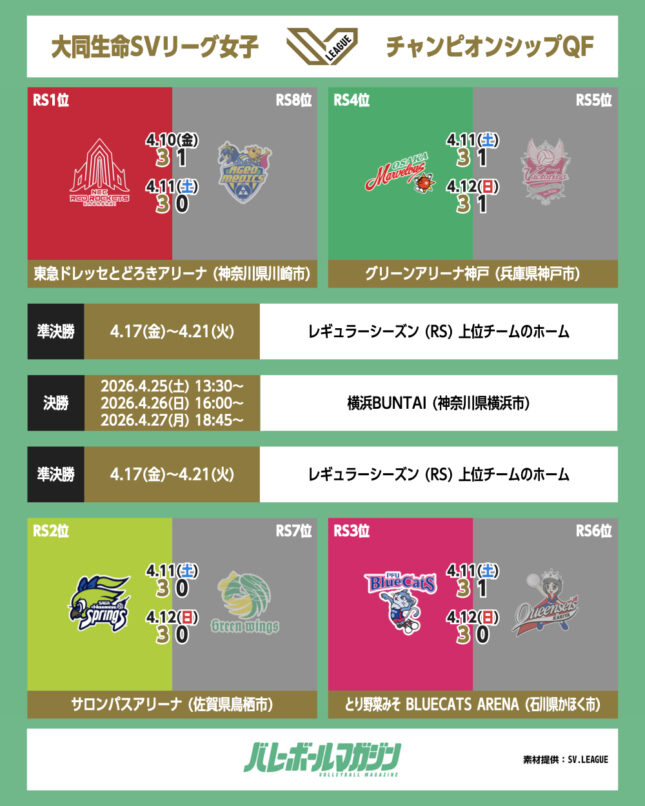 12日、バレーボール女子・大同生命SV.LEAGUE WOMENはチャンピオンシップ準々決勝GAME2の3試合が行われた。