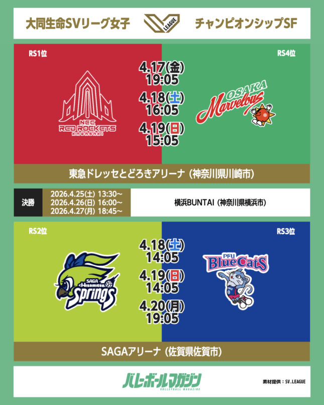 セミファイナルの組み合わせはNEC川崎×大阪MV、SAGA久光×PFUに SV女子