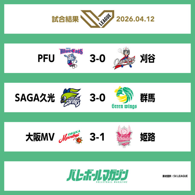 大同生命SV.LEAGUE WOMEN・12日の結果