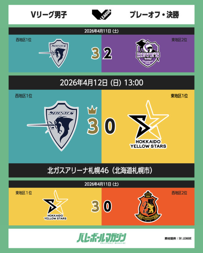 北ガスアリーナ札幌46でクボタスピアーズ大阪と北海道イエロースターズが対戦し、セットカウント3-0のストレートでホームのクボタスピアーズ大阪が勝利。初優勝を果たした。プレーオフMVPはクボタ・小磯智紀選手が受賞した。