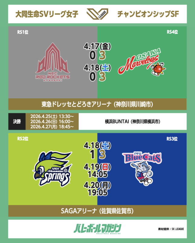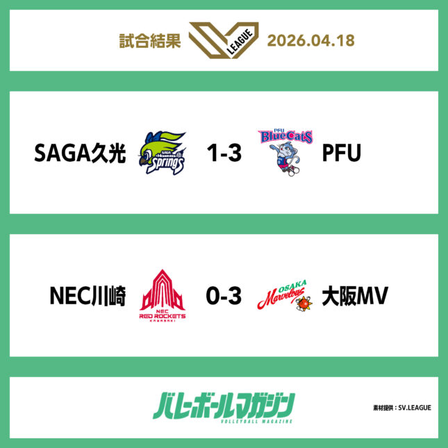 - 大阪MVがNEC川崎にストレート勝利で先勝。田中瑞稀主将「夜の試合に合わせて全員がスタートから動けるように調整できたことがよかった」SV女子セミファイナル [SV女子] / 2026.04.18
