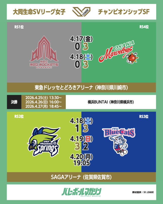 - SAGA久光が2試合連続のフルセットを制す。ファイナルはSAGA久光✕大阪MVの組み合わせに SV女子セミファイナル [SV女子] / 2026.04.21