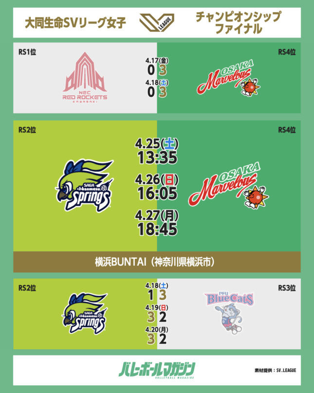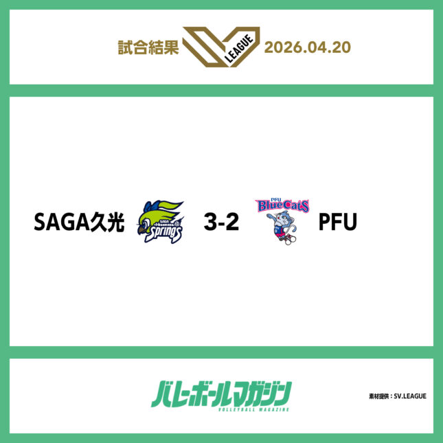 - SAGA久光がPFUにフルセットで勝利し、1勝1敗に。20日にGAME3を開催 SV女子セミファイナル [SV女子] / 2026.04.20